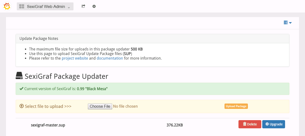 As we plan to add lot of features and content to the SexiGraf appliance, we wanted to make update flawless for you. We didn’t want to say to you “Please update by redeploying a new appliance”. So we built a native updater that’s available in this section. When we will be releasing a new version of SexiGraf, we will provide you a *.sup package (for SexiGraf Update Package) that you will upload to your appliance thanks to this page. After the upload is successfull (it shouldn’t be long as the package will be usually just a few hundred Kb), you will be able to start the upgrade process. After a few confirmation (we’re never too safe), the upgrade process will start, letting you enjoy the up-to-date version of SexiGraf. Without any dataloss obviously.