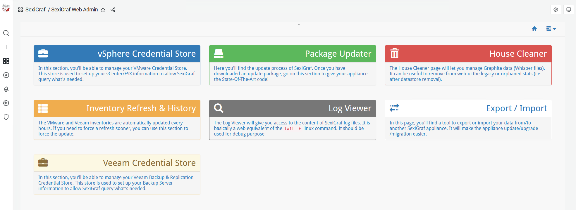 This section have been added to make debugging easier for everyone. It will provides log detail for several components of SexiGraf (such as VI Offline inventory, or statistics runner, …). You will be able to display on your browser the content of these logs for troubleshooting purpose. It can guide you to identify the source of the issue (bad username/password combination, runtime error, …) and can be useful for us to give you a hand if you need.